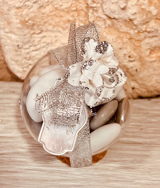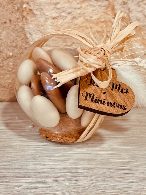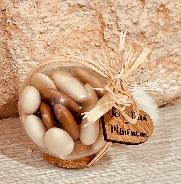le contenant parfait pour des dragées ne doit pas être ni trop grand ni trop petit. Pour un mariage, la tradition veut que l’on offre cinq dragées ; chacun d’entre eux symbolisant un vœu adressé aux jeunes mariés : fécondité, bonheur, prospérité, santé et longévité. De plus, un nombre impair de dragées représenterait l’indivisibilité de l’union… Les supersticieux et les supersticieuses savent à quoi s’en tenir ! Aujourd’hui, en revanche, le nombre de dragées à offrir est davantage déterminé par la gourmandise que par le symbole. Alors, c’est un peu comme bon vous semble, disons que la moyenne se situe entre 20 et 40 g par personne soit environ 8 à 18 dragées amandes.
